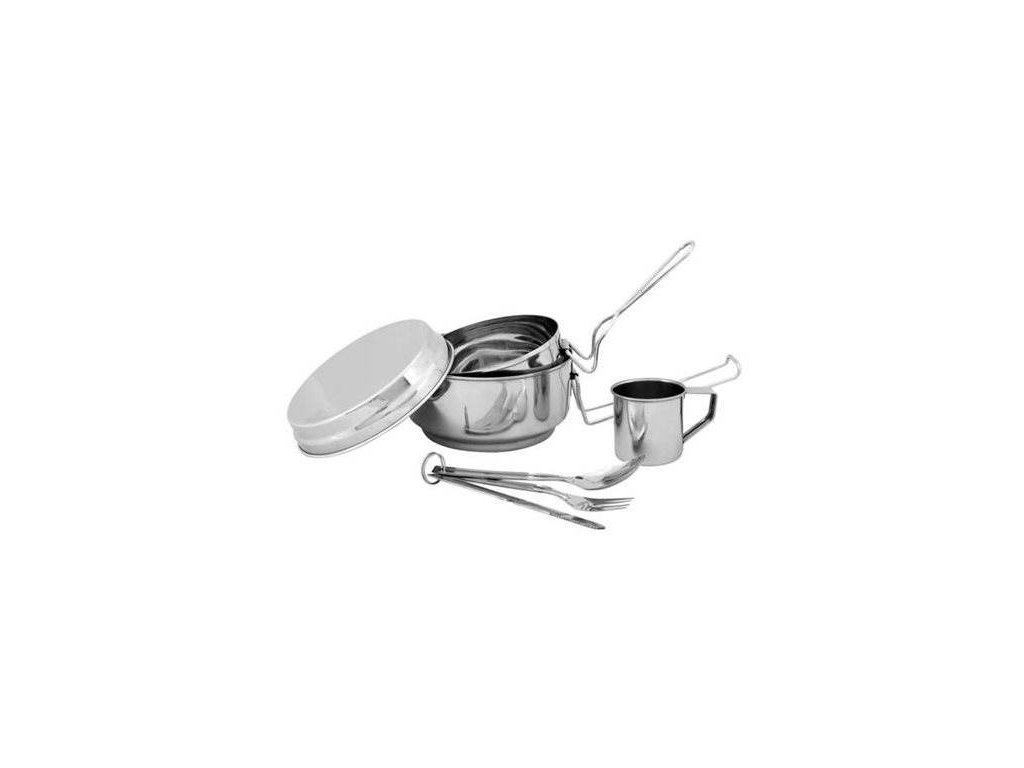 Outdoorové nádobí 7dílná kempingová sada Store Line z nerezu, 1x velký ešus 15cm s víčkem objem 1.40L, 1x malý ešus 13cm, objem 1L, 1x hrnek 7cm objem 170ml, 1x vidlička, 1x lžíce,1x nůž