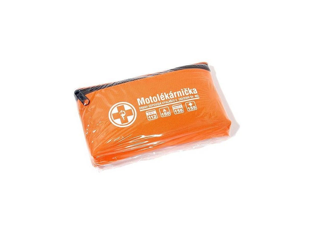 Lékárnička pro motocykly, obsah podle vyhlášky MDS ČR č. 216/2010 Sb. příloha 14, provedení textilní brašna, součást povinné výbavy motocyklů a skútrů
