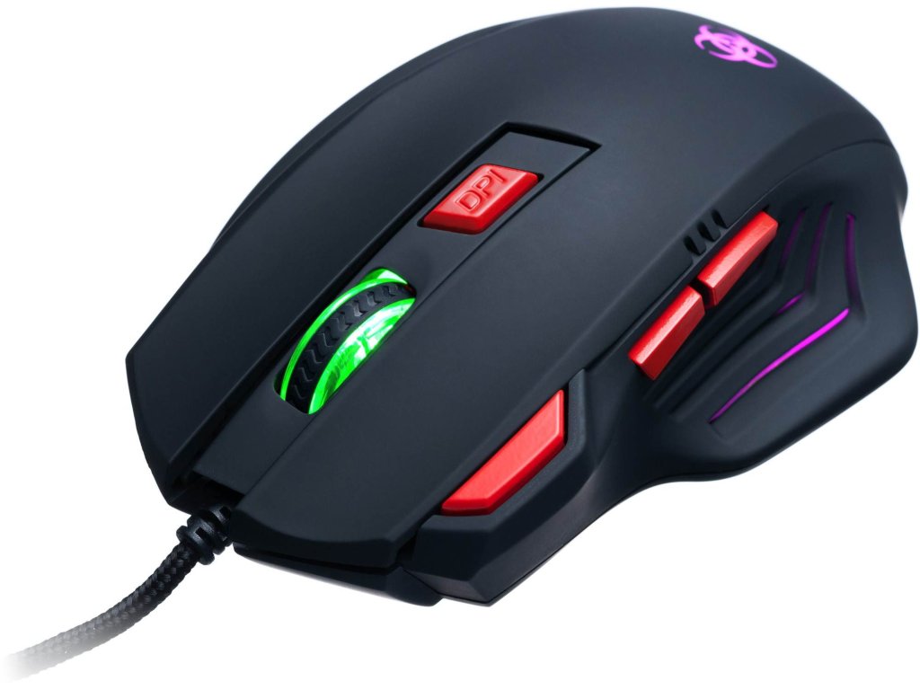 Herní myš drátová, laserová, 3200DPI, 7 tlačítek, vícebarevné, vhodná pro praváky, velikost L, USB, délka kabelu 1.8m, černá