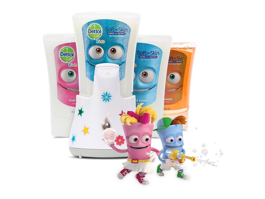 Dárková sada obsahuje: 1x Dettol Kids Bezdotykový dávkovač mýdla Dobrodruh 250 ml, 3x Dettol Kids náhradní náplň 250 ml