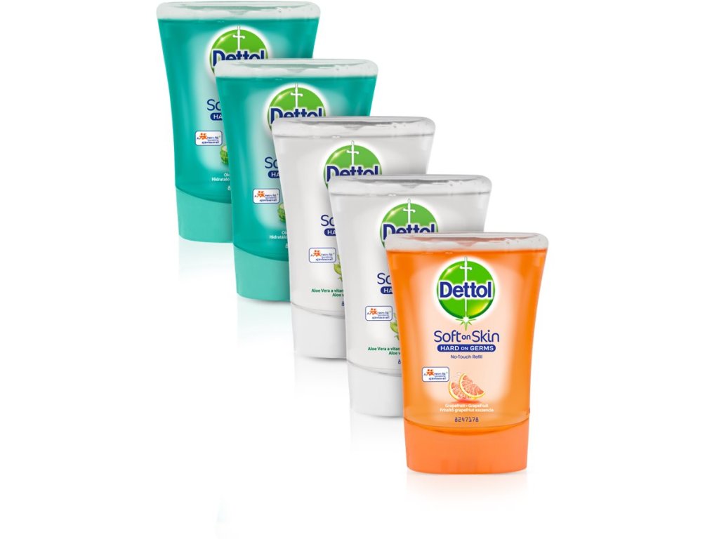 Tekuté mýdlo obsahuje: 2x Dettol náplň Aloe Vera 250 ml, 2x Dettol náplň Okurka 250 ml , 1x Dettol náplň Grapefruit 250 ml