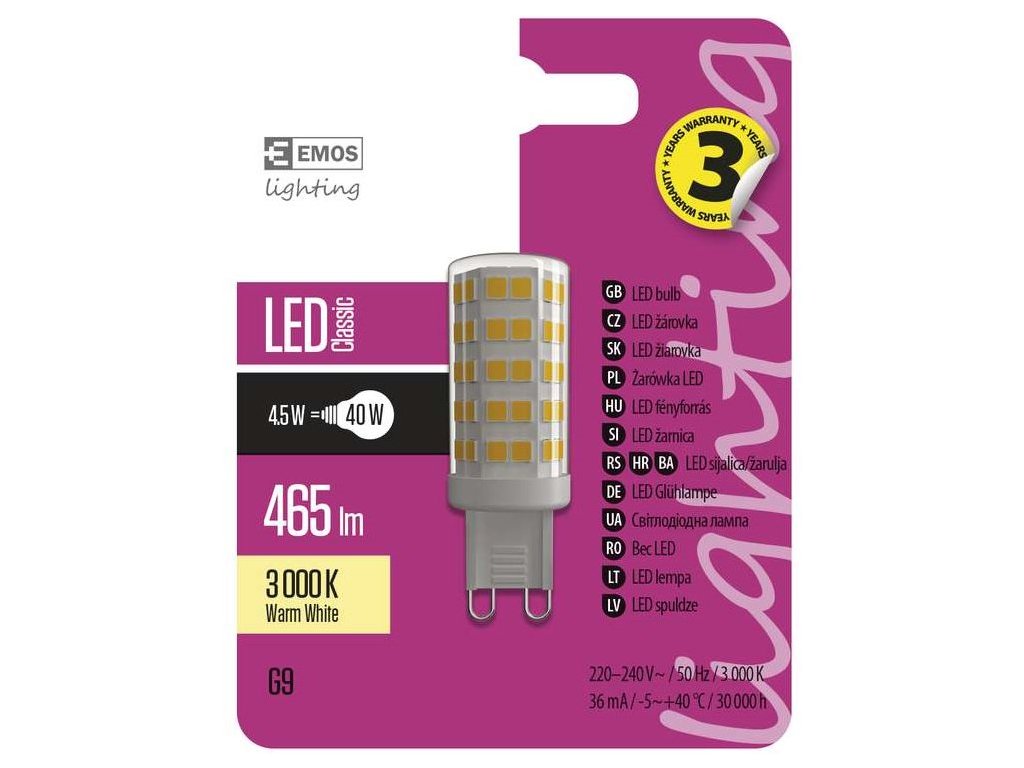 LED žárovka náhrada za žárovku 40 W, světelná účinnost 103 lm/W, světelný tok/svítivost 465 lm, teplota chromatičnosti 3 000 K, úhel vyzařování 300°, životnost 30 000 hodin