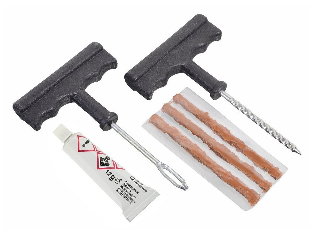 Opravná sada pneu pro nouzovou opravu běžných průpichů běhounu pneumatiky, čistící jehla, provlékací vidlička, 3ks opravných knotů, lepidlo na bázi cementu