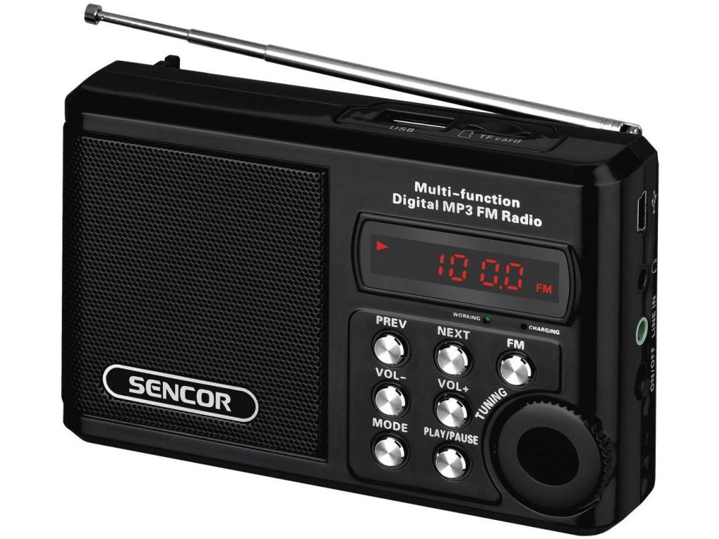 Rádio přenosné, FM tuner, MP3, teleskopická anténa, vstup na SD karty, audio jack 3.5mm, AUX-IN 3.5mm (vstup), USB