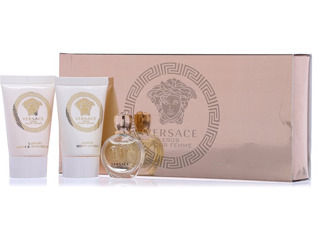 Dárková sada Eros Pour Femme nabízí ochutnávku okouzlující vůně Versace. Obsahuje EDP, sprchový gel a tělové mléko, které jsou svou velikostí ideální na cesty....