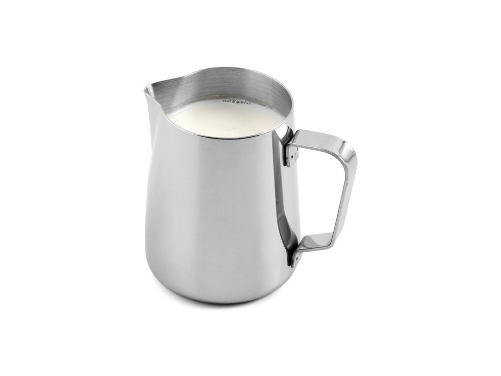 Konvička na mléko z nerezové oceli k přípravě mléčné pěny, vhodná také pro kávovar s tryskou na horkou páru, objem 0.2l, nalévací hubice na okraji, lemovaný okraj, plochá kovová rukojeť, na teplé i studené mléko, k přípravě mléčné pěny
